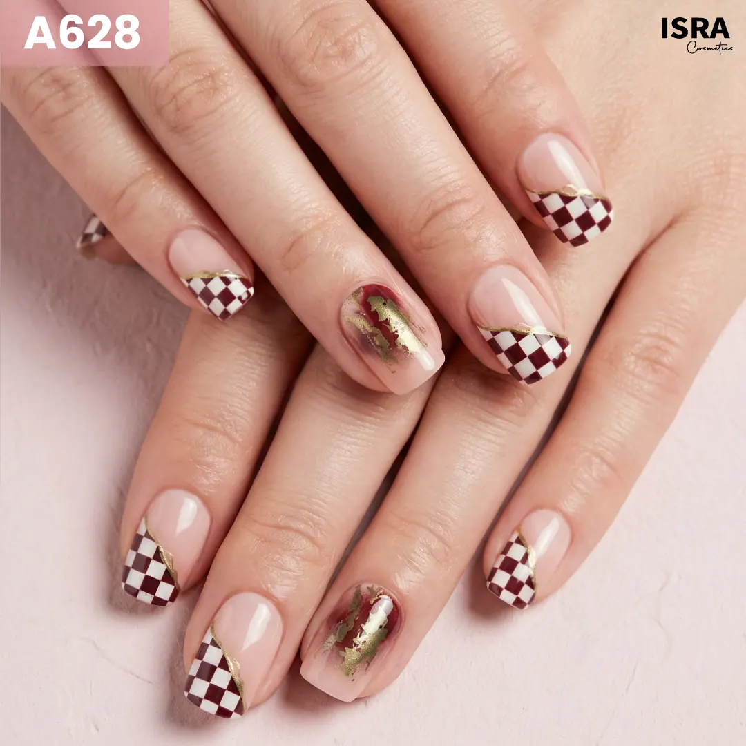 Brown and Gold A628 pairs rich chocolate tones with luxe gold accents and geometric tips for a refined, statement look.