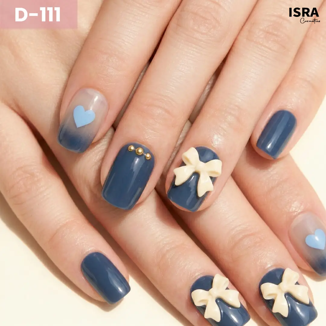 Cool periwinkle tones with soft heart accents, finished with a delicate bow and subtle gold details for a dreamy, polished look.