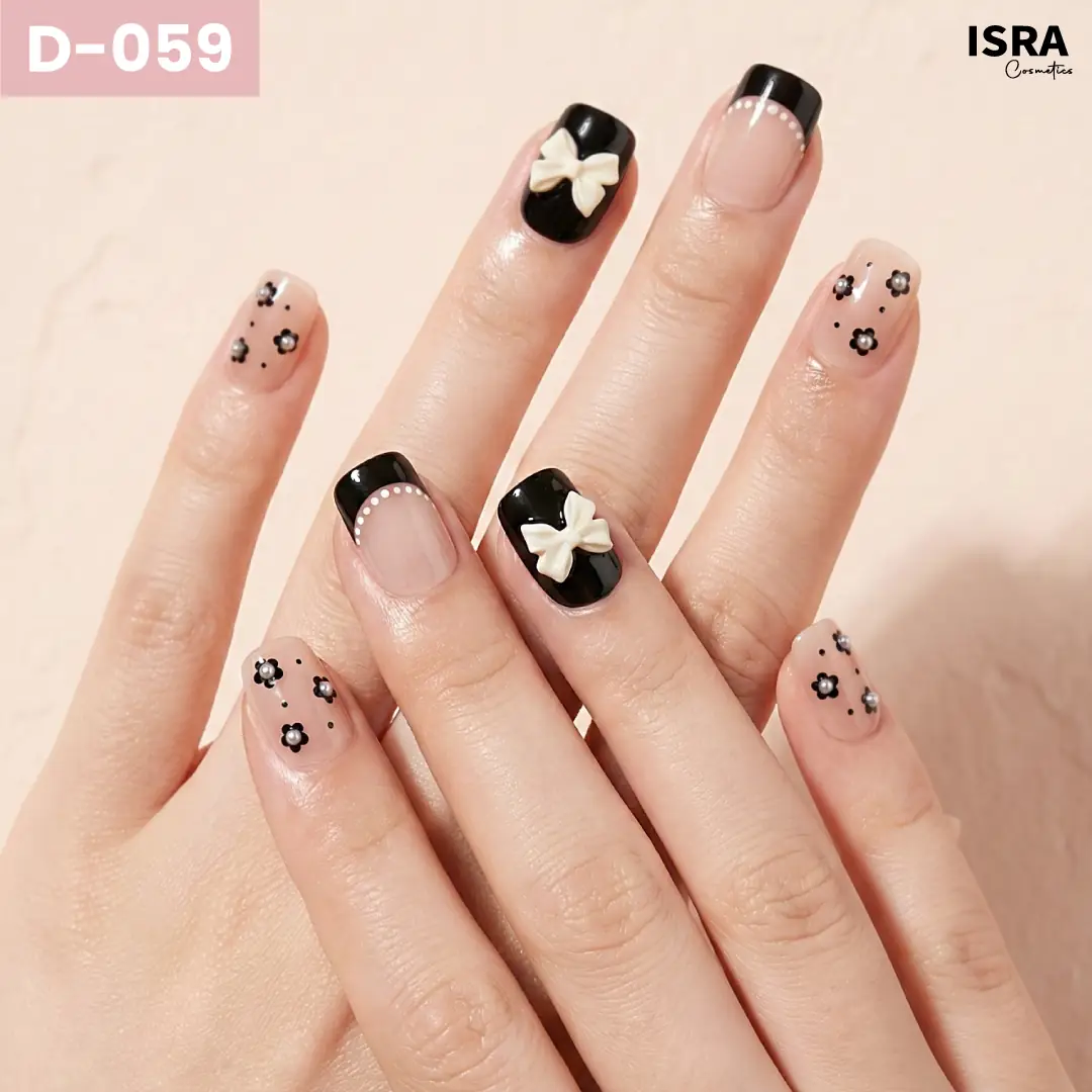 Taupe Black with White Hearts D059 blends soft taupe tones with glossy black tips, finished with delicate white heart and bow details for a charming contrast.