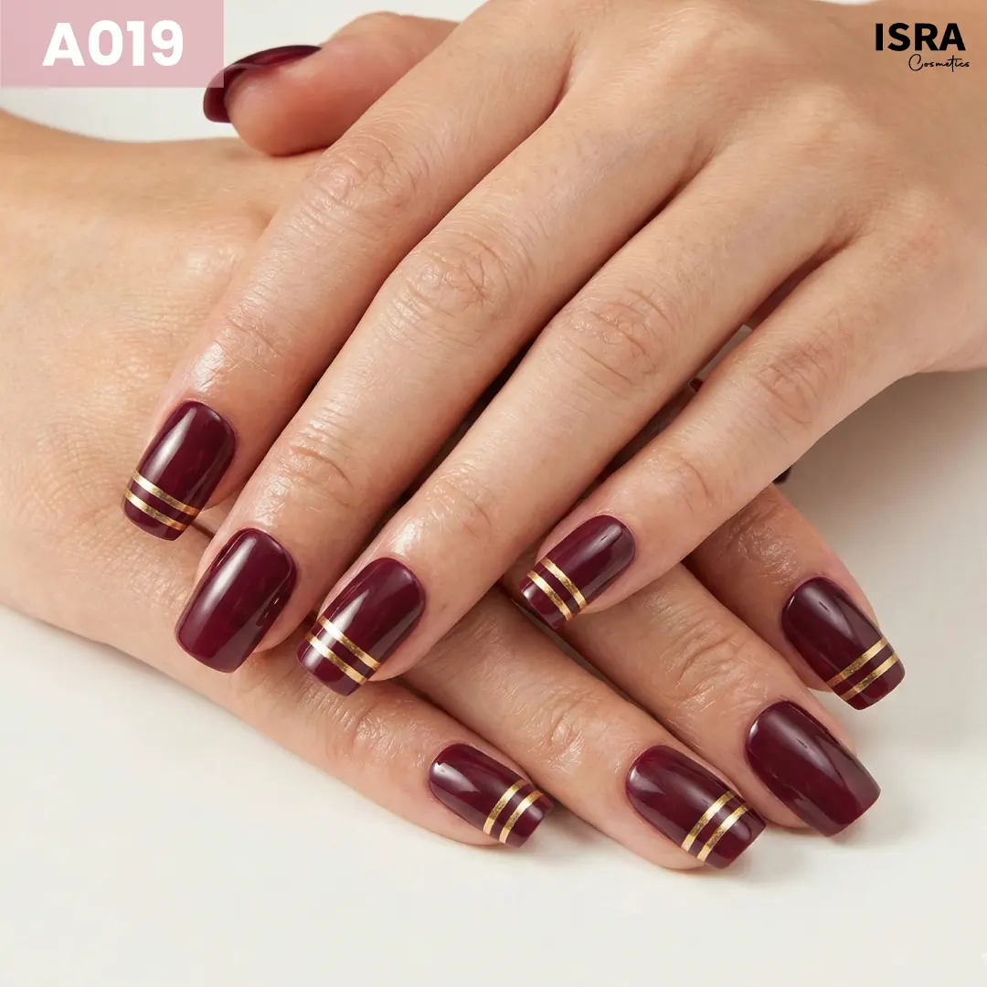 Wine Red and Gold A019 nails give a rich, luxurious look that feels bold and refined. No salon. No effort. Just press on and look expensive.