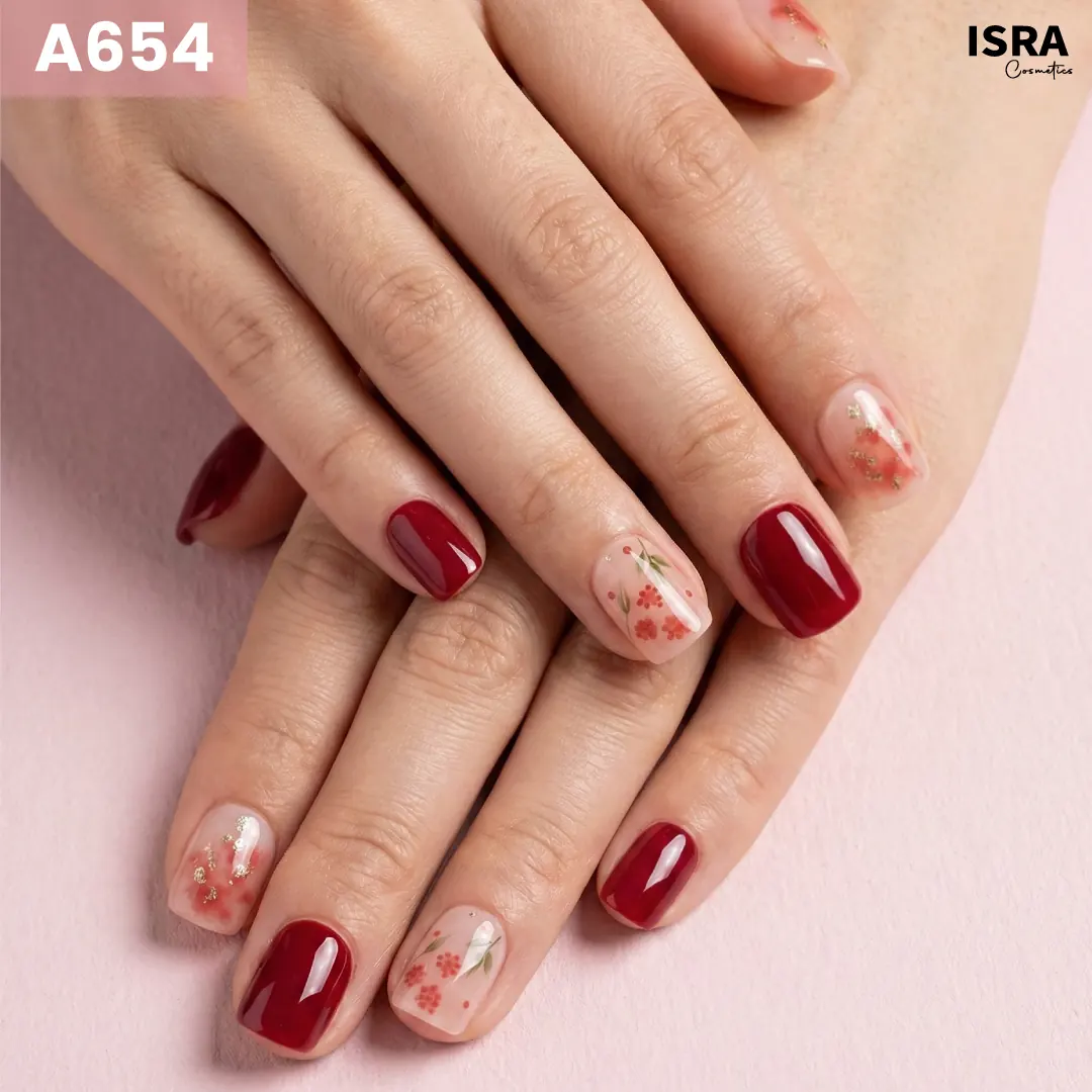 Wine Red Flower A654 looks rich, elegant, and softly romantic. The deep wine-red glossy nails add a bold, classic feel, while the sheer nude accent nails feature tiny red floral motifs with subtle gold foil detailing. This contrast keeps the design refined but not heavy. It’s a beautiful choice for formal events, festive wear, or anyone who loves timeless red tones paired with delicate floral art.